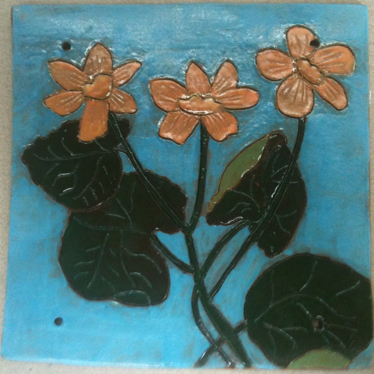 I made these tiles because I envisioned a "quilt" of ceramic tiles. Despite the constant reminder from my hand-building teacher, who wanted me to apply a white porcelain slip before carving and painting, I left them "clay" colored for painting. I really wanted them to look like clay pieces, not watercolors or cloth or anything else. I made the tiles large (8"x8") and very thin.